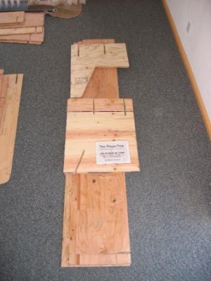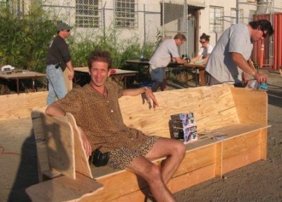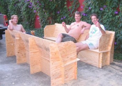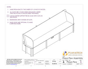 Once you have it all assembled, you might find that you can cut a slot in each of the pieces you removed from the center supports, and then shove one onto each side of the Playa Pew as a drink tray. Voila, exactly two sheets of ply, just like we promised! No moopage here but some sawdust. Please do not forget your $5/sheet royalty to the art gods, or your Playa Pew will give your ass splinters! That’s $10 per pew for those who can’t add.