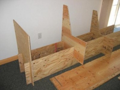 To make a Playa Pew, cut the front support, rear support, and seatback out of one sheet of ply down the long way instead of the short way like the love seats. On the second sheet, cut the seat the long way, and then cut the large remainder into four identical 24″ wide rectangles. Clamp the four together to cut your slots just like the Playa Love Seat and voila. For all the long boards, do the end slots just like the love seat, and add an extra pair of slots to the front and rear supports 1/3 and 2/3 along their lengths to hold the center supports.