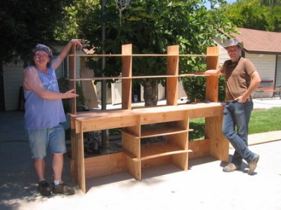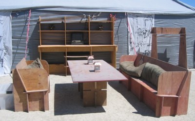 Desert survival guides stress liquids but largely ignore food, so we suspect half the drinking establishments in Black Rock City will use these as back-bars. But it’s a kitchen, honest, at least on the playa. At home, it’s an 8′ wide credenza for your dining room, entertainment center, office, or … well, just build two!!