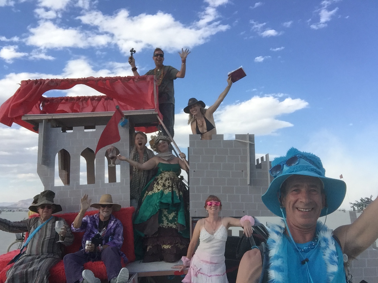 About the castle – it started as a 1991 Volvo sedan with 275,000 miles on it, got chopped behind the cab by some weld-happy burners and turned into a renegade mutant at BM14, then sat rusting until Sunshine bought it for $500 in May 2016. Then it sat some more until mid-July, when he and Glimmer went crazy on it for a month with paint, wood, fabric, and lights. Thanks to a bunch of help from friends (and several grand in repairs, upgrades, and decor), it ran 10 days on playa in 2016 with no problem larger than a squeaky fan belt. Can you believe NONE of the Org shops had belt dressing when we asked? They all said “OMG if you find some please bring it!”. So next year we did:)